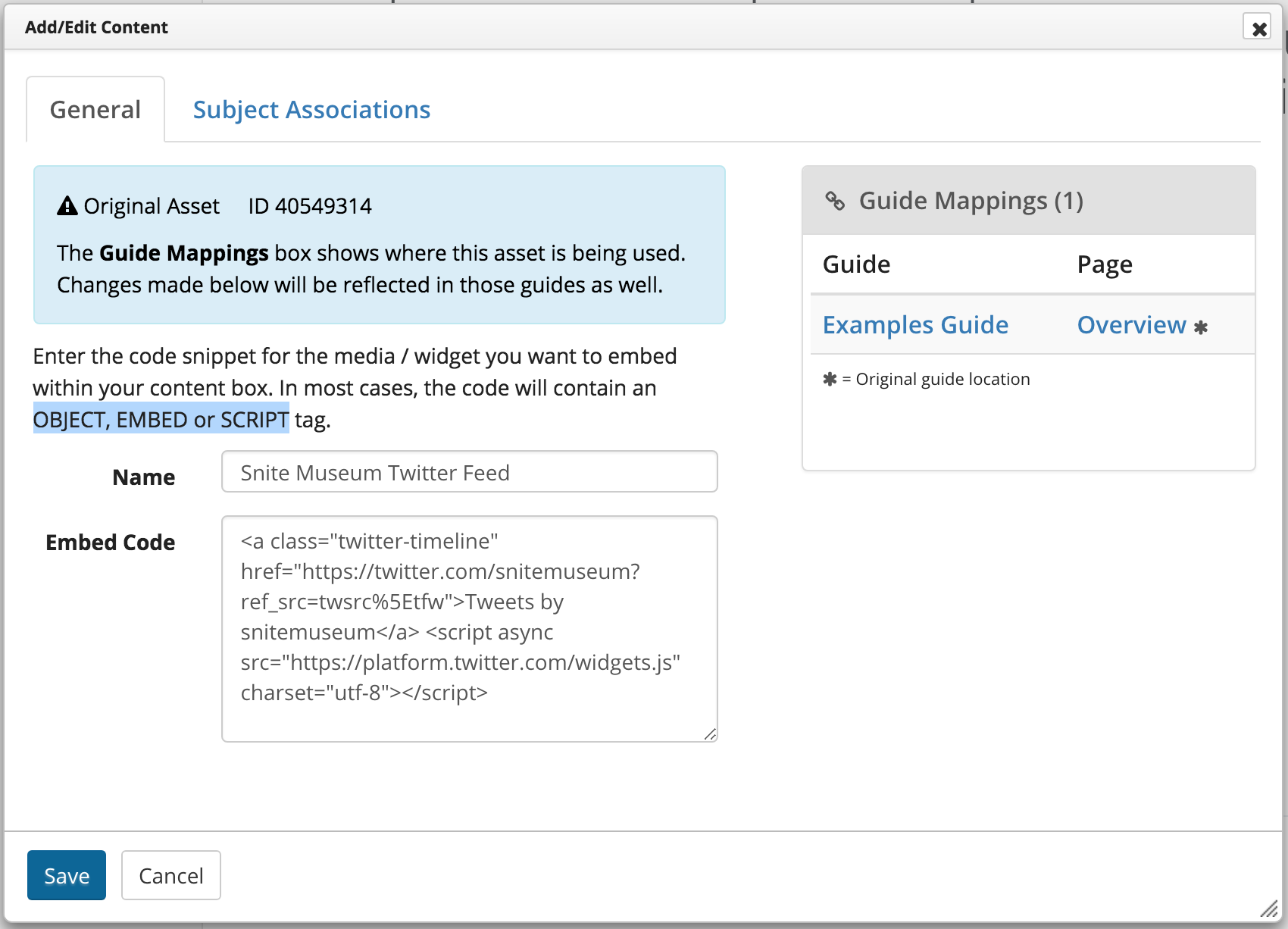 Media widgets are system components for use with most third party APIs. You may use the media widget to embed media resources such as twitter streams. The API will handle <embed>, <object>, and <script> elements.